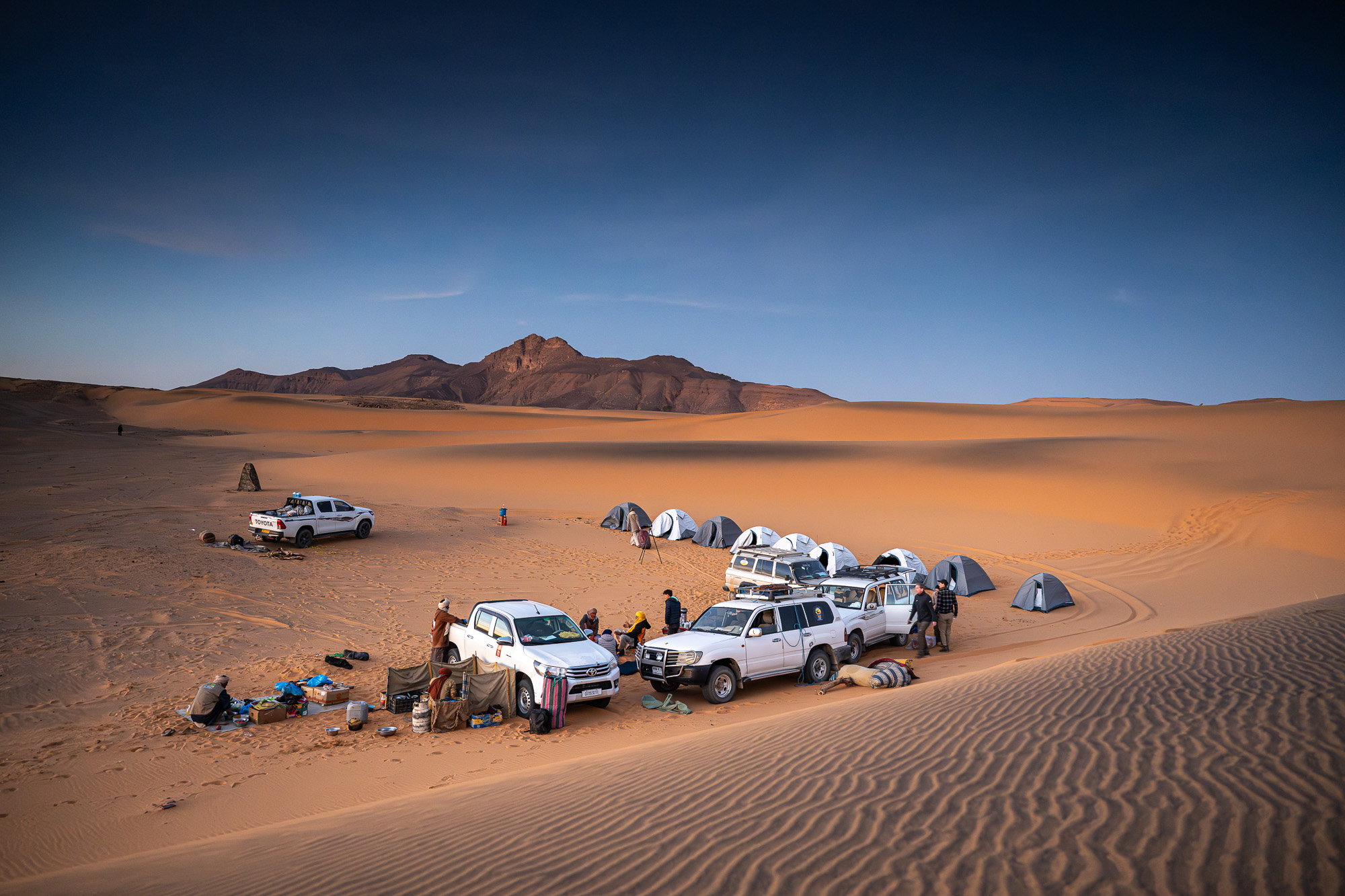 Der Tag beginnt bereits vor Sonnenaufgang um das besondere Morgenlicht in der Wüste einzufangen. Die Morgensession machen wir in der nahen Umgebung der Dünen von El Birdj. Danach genießen wir ein ausgiebiges Frühstück im Camp. Frisch gestärkt geht es mit den Geländewagen durch die Dünen. Unsere Reise führt uns nach Moulennaga, einem der beeindruckendsten Orte in der algerischen Sahara. Besonders die Kombination aus Sanddünen und bizarren Felsformationen machen diese Gegend so besonders. Das Spiel von Licht und Schatten bietet unzählige kreative Möglichkeiten für die Fotografie. Wir nehmen uns Zeit, um die Details dieser surrealen Landschaft zu erkunden und festzuhalten. Am Abend schlagen wir hier unser Camp auf und genießen eine weitere magische Nacht unter den Sternen.
