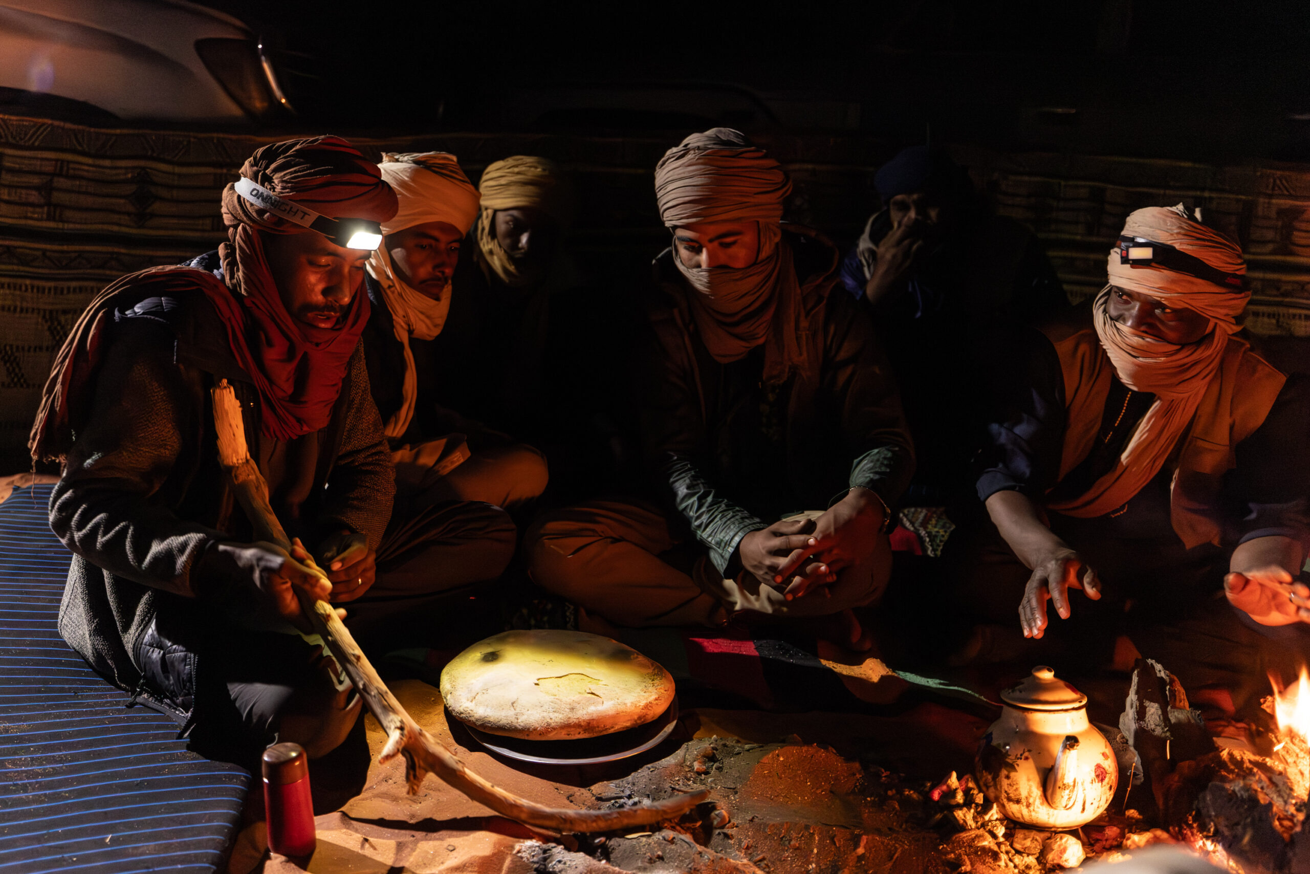 Unser einheimisches Team besteht aus etlichen Personen. Jeder hat dabei seine eigenen Aufgabe. Mit dabei ist unser einheimischer Fotoguide. Er organisiert diese Tour, kennt viele tolle und abwechslungsreiche Plätze in der Wüste und ist ein toller Mensch. Ebenfalls begleitet uns ein deutschsprachiger Guide. Dieser kann uns einiges über die Kultur, Felsmalereien etc. erzählen. Bein einem ausgebuchten Workshop reisen wir mit fünf 4×4 Autos. Diese benötigen natürlich Fahrer. Die wichtigsten Männer sind wie immer die Köche. Täglich zaubern sie uns leckeres Essen. Am Abend darf natürlich jemand für die Teezeremonie und Musiker nicht fehlen. Auch wenn wir schon im Bett liegen und schlafen musizieren die Einheimischen oft noch weiter und genießen das Leben am Lagerfeuer unter dem Sternenhimmel.